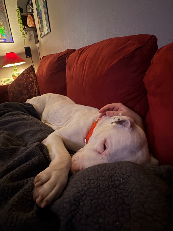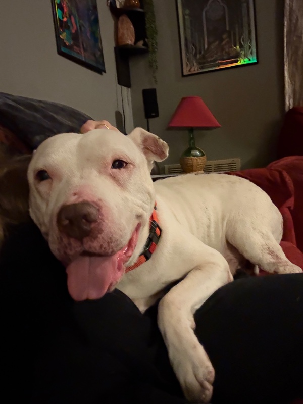 From his advocate: Diesel is an older, deaf pit bull and an absolute sweetheart. Despite his strong looks, he’s a gentle, cozy love bug who just wants to nap, snuggle under blankets, and quietly be by your side. He loves resting his head on you and will look into your eyes in a way that completely melts your heart.