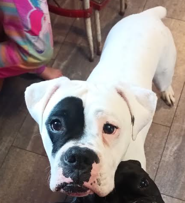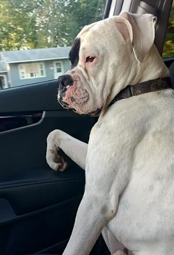 From his caregiver: Muzzy is a 5 year old male boxer. He is a happy boy who has never met a stranger and REALLY wants to ride on the school bus. He is good with adults, kids, cats, and livestock (we have goats and chickens). However, he does not get along well with our other dog, so he would need to be the only dog. We live out in the middle of no where, so the use of a leash has been limited to vet trips but he does well when we take him. He loves car rides. We absolutely love him, but we can’t see how it could be good for him to feel the need to fight constantly with our other dogs. He will be your best friend and snuggle buddy.